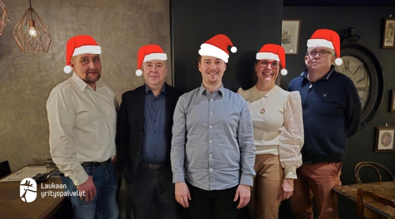 Kiitos kaikille yrittäjille kuluneesta vuodesta ja työstänne Laukaan hyväksi! Laukaan kunnan yrityspalvelutiimi (kuvassa vasemmalta oikealle Kimmo, Reijo, Eero, Heli ja Lauri) toivottaa sinulle rauhallista joulua ja menestystä uuteen vuoteen 2026!